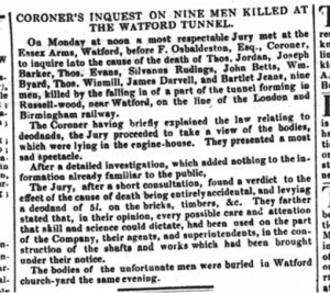 “one of the shafts of the tunnel of the intended railroad to Birmingham, which runs through the Earl of Essex’s estate, at Russell Farm Wood, about two miles beyond Watford, had fallen in, and been attended with an immense sacrifice of human life”
