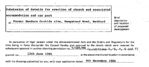 In 1986 planning permission was given to build “church and associated accommodation and car park on the former Sanders Orchids site”.