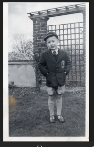 Photograph of a local resident in 1956 – on his first day of Cassiobury School. The pile of bricks on left in background was for the building of 306 Hempstead Road (Service Road) which was bought by S J Cooper in 1957.