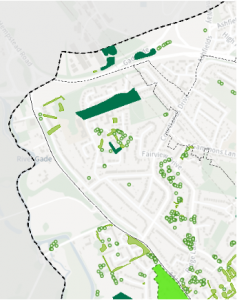 “Greenbanks Wood LWS Ancient woodland site supporting a semi-natural, open, high canopy locally dominated by mature sweet chestnut with areas of ash, wild cherry and sycamore with some English oak, silver birch Betula pendula and holly. There is a large open glade of rough grassland in the middle of the wood. Wildlife Site criteria: Ancient woodland with a seminatural canopy and field evidence suggesting an ancient origin; shown on Bryant’s map (1822); >1 ha”