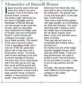 Alex Bannister, a cricket writer and journalist, who was cricket correspondent for the ‘Daily Mail’ from 1947 to 1979. His family worked at Russell Farm, and lived in the lodges.