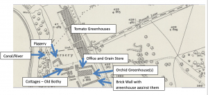 At some stage the old Kitchen Garden area was bought by Sanders Orchid growers and the next map shows the layout in 1939. The notations were provided by Jack Ruck.