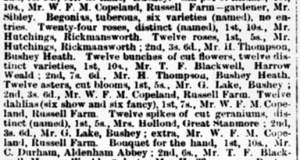 Alfred Dover was living with his family at The Gardens, Russell Farm in 1901. In 1902 he advertised for new situation, but according to the Electoral Register he was still living at Russell Farm in 1906. It appears he was retained when Russell Farm was sold to Lewis Evans in 1902. By 1911 he is living elsewhere in Watford, as a gardener. The advert in 1902 specifically mentions experience with orchids.