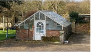 The small greenhouse is the remains of the larger one that used to stand there. The remains of old foundations are still under the garden.