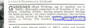 Alfred Dover was living with his family at The Gardens, Russell Farm in 1901. In 1902 he advertised for new situation, but according to the Electoral Register he was still living at Russell Farm in 1906. It appears he was retained when Russell Farm was sold to Lewis Evans in 1902. By 1911 he is living elsewhere in Watford, as a gardener. The advert in 1902 specifically mentions experience with orchids.